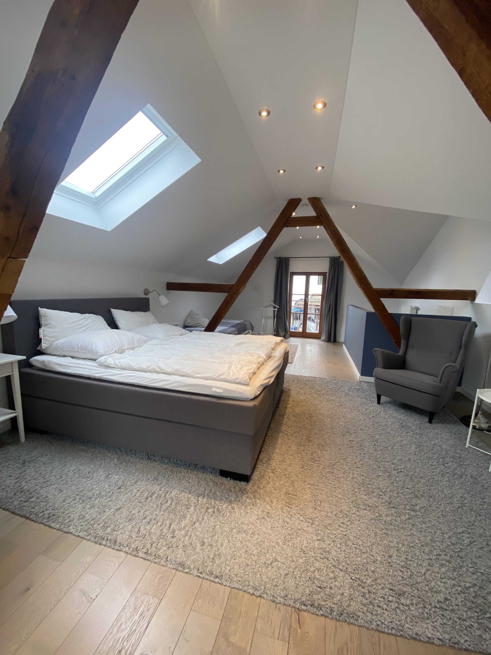 Die Ferienwohnung im „Haus am Fluss“ hat zwei Etagen: ebenerdig befinden sich Wohnküche, Wohnzimmer mit einer Schlafcouch und das Bad. Im Dachgeschoss ist der großzügige Schlafbereich mit ca. 30 Quadratmetern. Gerne stellen wir hier in Absprache auch ein Babybett oder eine Matratze für jüngere Kinder zur Verfügung. Die Ferienwohnung liegt zentral und dennoch ruhig in einer Einbahnstrasse, die nur für Anlieger frei befahrbar ist.